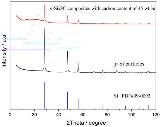 Figure 2 shows the XRD patterns of p-Si particles and p-Si@C composites with carbon content of 45 wt.%. For p-Si particles, the diffraction peaks at about 28.4°, 47.3°, 56.1°, 69.1°, 76.4°, 88.0°, and 95.0° correspond to (111), (220), (311), (400), (331), (422), and (511) planes, respectively [32,33]. p-Si@C composites exhibited the same diffraction peaks as that of micro-size Si particles, indicating that the crystal structure of p-Si particles was not affected and no new species were produced during the preparation of p-Si@C composites. On the other hand, an unobvious wide diffraction peak at about 20° for p-Si@C composites indicated that the carbon in composites was amorphous.