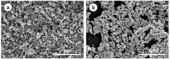 The results of galvanostatic charge–discharge test are shown in Figure 6. From Figure 6a, the reversible capacity of p-Si particles faded quickly with the increase of the charge–discharge rate, although they exhibited a high reversible capacity at 0.1 A·g−1. Moreover, the coulombic efficiency of p-Si particles obtained from the charge and discharge capacity was relatively low. The coulombic efficiency at 0.2 A·g−1 increases slowly to 95 from 85% implying the continuous consumption of Li+ and formation of SEI (Solid electrolyte interface) film on the surface of p-Si particles during cycling. Note that, the reversible capacities of Si/C composites prepared with and without the sulfur-melting process all showed a much higher capacity when the current densities increased to 1 A·g−1 from 0.2 A·g−1. Moreover, when the current densities returned to 0.5, 0.3, and 0.2 A·g−1 from 1 A·g−1, the reversible capacities of Si/C composites could be returned to their original level. Moreover, the coulombic efficiencies of Si/C composites prepared with and without sulfur-melting process remain above 98% and 96% after the first cycle at 0.1 A·g−1, respectively, indicating the formation of a stable SEI film. These results indicate that PANI-based carbon layer in Si/C composites can effectively alleviate the volume expansion of silicon during charging–discharging process, so that the integrity of the electrode can be maintained.