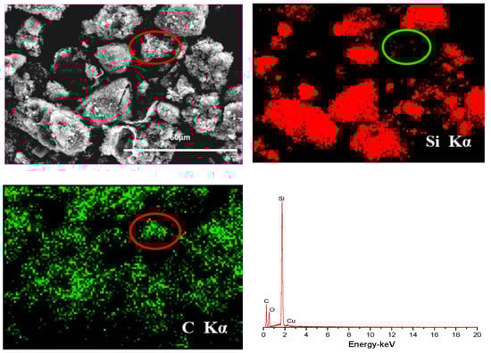 SEM images of p-Si particles and p-Si@C composites with a carbon content of 45 wt.% are shown in Figure 3. It is apparent that p-Si particles are bulky irregular particles, the p-Si@C composites are still well dispersed, but the particle size increased slightly. In order to observe whether the p-Si particles were evenly coated by carbon layer, energy dispersive spectroscopy (EDS) measurement for p-Si@C composites was carried out. Figure 4 exhibits the distributions of the elements Si and C in the tested area, respectively. As can be seen from EDS spectrum, Si and C elements were observed, and O element was also detected. Oxygen should come from amorphous silica layer formed on surface of silicon particles during the preparation of Si/C composites. From Figure 4, it can also be seen that the distribution of element Si is consistent with most of the shape of the particles in the tested area and the distribution of element C is homogeneous, demonstrating that the Si particles are uniformly coated by PANI-based carbon layer. The results of HRTEM further clarify that crystalline Si particles were well encapsulated by disordered PANI-based carbon layer, as shown in Figure 5b. The thick carbon layer could not only avoid the direct contact of Si particles with electrolyte, but also enhanced the electronic conductivity of composites. Furthermore, the carbon layer as an effective buffer could keep the stable structure of p-Si@C composites during the charge–discharge process. However, for the particle pointed out by an oval, C is the main element. The results indicate that a few pure carbon particles also exist in p-Si@C composites, because of the high mass ratio of aniline monomer and p-Si particles during polymerization.
