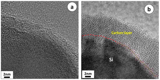 HRTEM images of (a) p-Si particles and (b) p-Si@C composites with carbon content of 45 wt.%.