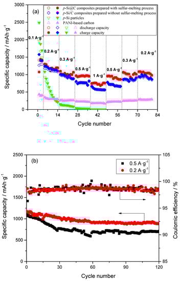 (a) High-rate capabilities for p-Si particles, PANI-based carbon and p-Si@C composites prepared with and without sulfur-melting process and (b) cycling stability of p-Si@C composites with carbon content of 45 wt.% at 0.2 and 0.5 A·g−1.