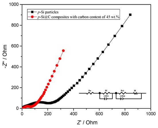 Nyquist plots for p-Si particles and p-Si@C composites.