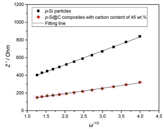 Z’ plots against ω−1/2 at the low frequency region of EIS (electrochemical impedance spectroscopy).