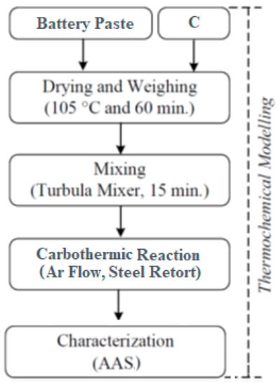 In the experiments two types of production techniques were used: the vacuum aided method and the Ar flowing carbothermal reduction method. Experiments without vacuum were conducted in a stainless steel retort with a volume of 9 L, under Ar flowing conditions. Ar gas was supplied to retort with a flowing rate of 1 L/min. We produced reaction gases and purged Ar to keep the retort atmosphere in reducing conditions while also carrying gas for Zn vapor. Zn evaporated after the oxide reduction occurred and was carried out of the retort via Ar gas. CO2 gas re-oxidizes Zn at lower temperatures, thus Zn was obtained as ZnO in fume dust. Coke used as a carbon source in order to reduce the ZnO. Experiments were done on a stainless steel plate with 150% excess carbon without considering the initial carbon of battery paste. The flowchart of the experimental studies is given in Figure 1.