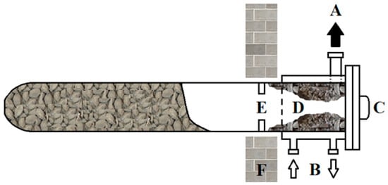 Schematic sketch of experimental setup: (A) vacuum pump; (B) water inlet-outlet; (C) retort cap; (D) crown Zn; (E) radiation shield; (F) furnace wall.