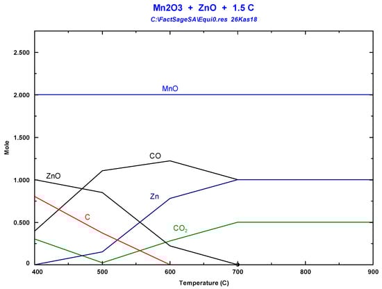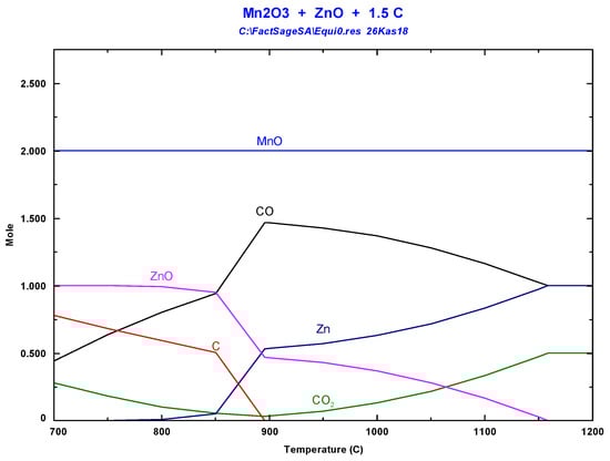 Figure 4 shows reaction products in an Ar flowed situation. ZnO reduction starts at 850 °C and the reaction is completed at 1150 °C. MnO is produced by thermal dissociation of Mn2O3 at elevated temperatures and thus decreases the C content in the mixture. The reaction starts with direct reduction of ZnO by C then proceeds with indirect reduction by CO in the retort atmosphere and equilibrium observed at 1150 °C.