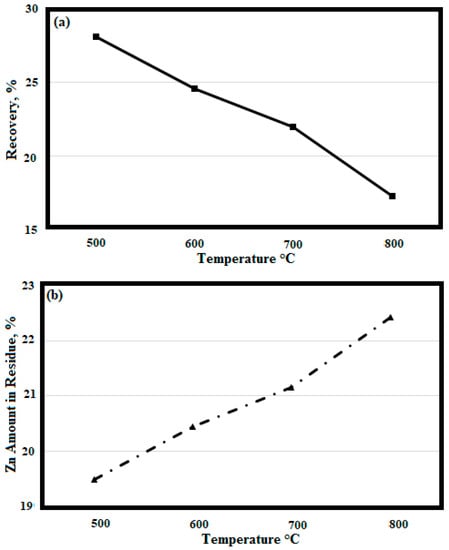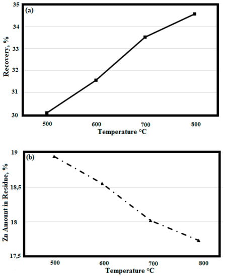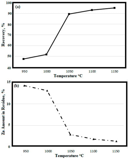 (a) Zn recovery, (b) Zn amount in residue with coke (1 h, 0.1 mbar vacuum, various temperature).