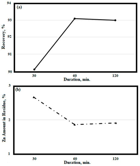 In the second experiment, the set effect of time was investigated. The experiments were conducted 1100 °C for 30, 60 and 120 min of duration time. Figure 6 shows that best result has been detected for the 60 min experiment with 93.1% Zn recovery. In parallel with this result, the lowest amount of Zn in the residue was determined as being 1.86% in the same experiment.