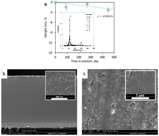 The VPG membrane (Vycor® 7930, Corning) studied in this work has been extensively characterized in the literature for its pore structure and investigated for gas and vapor separations and ultrafiltration of liquid. It has a rather uniform pore size distribution with an average dp of ~4 nm (see insert of Figure 1a), porosity of ~28% and chemical composition of in weight ratio [24]. To examine its chemical stability in the highly acidic and oxidizing solution of VRFB, a VPG membrane disc was immersed in a solution of 2 M V5+ (VO2+) in 2 M H2SO4, which is the most aggressive solution involved in the VRFB operation, for over a year during which the weight of the completely washed and dried (2 h at 200 °C) disc was monitored. The disc showed no structural changes by visual inspection and porosimetry test. The post-treatment VPG disc had a Brunauer-Emmett-Teller (BET) specific surface area of 248 m2/g, which was essentially the same as that of the fresh membrane. As shown in Figure 1a, the VPG membrane experienced only 1.57% (=0.0043% × 365) weight loss over an entire year. The SEM images of the VPG membrane are shown in Figure 1b,c.