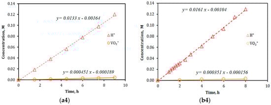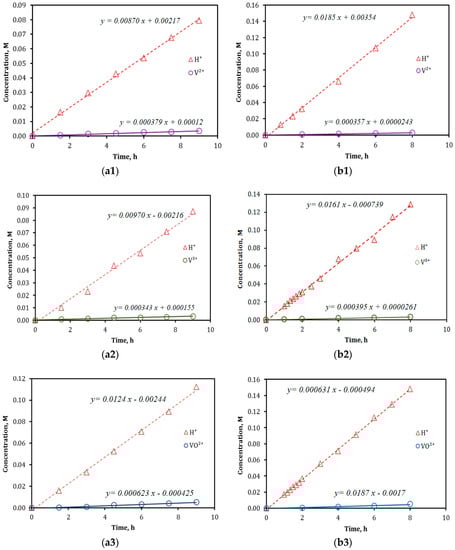 Results of ion diffusion measurements for VPG (a1–a4) and Nafion-117 (b1–b4) membranes using feeds of 2 M vanadium sulfate solutions in 2 M H2SO4: (a1,b1)—V2+ vs. H+, (a2,b2)—V3+ vs. H+, (a3,b3)—V4+ (VO2+) vs. H+, and (a4,b4)—V5+ (VO2+) vs. H+.