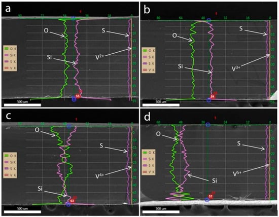 Results of EDS line-scan along the thickness of the VPG samples after equilibration in solutions of different vanadium ions: (a) V2+, (b) V3+, (c) VO2+, and (d) VO2+ solution in 2 M H2SO4, respectively.