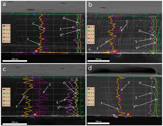 Results of EDS line-scan along the thickness of the Nafion membrane samples after being treated in solutions of different vanadium ions: (a) V2+, (b) V3+, (c) VO2+, and (d) VO2+ solution in 2 M H2SO4, respectively.