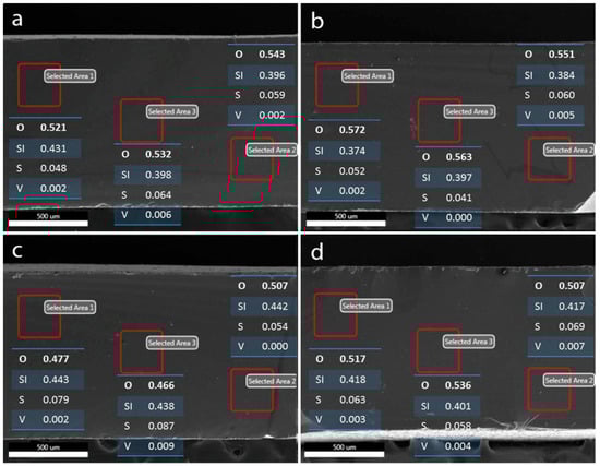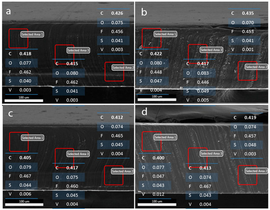 Results of elemental survey by EDS point analysis at various depths of the Nafion-117 membrane after being equilibrated in different vanadium ion solutions: (a) V2+, (b) V3+, (c) VO2+, and (d) VO2+ solution in 2 M H2SO4, respectively.