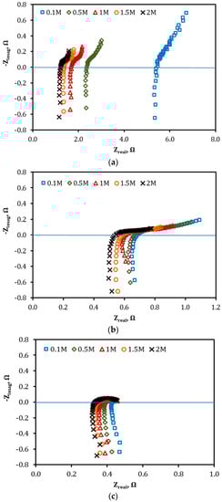 EIS measurements were performed for the VRFB single cell when equipped with the VPG and Nafion ion separators, respectively, when both sides of the membrane were filled with H2SO4 solutions of identical concentration varying from 0.1 M to 2.0 M. The resultant EIS spectra are presented in Figure 7.