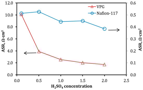 ASR of the VPG and Nafion membranes as a function of H2SO4 concentrations.