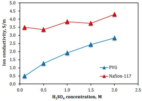 Ion conductivity in the VPG and Nafion membranes as a function of H2SO4 concentrations.