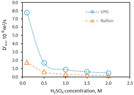 The proton diffusivity values for the two membranes are calculated based on the conductivity data and the values determined by titration. The equilibrium inside the VPG membrane pore volume measured by titration method was 2.04 M when immersed in a 2 M H2SO4 solution at room temperature. Considering the experimental error, which was ±5%, the H2SO4 partitioning factor for the VPG membrane can be taken as 1.0, i.e., the H2SO4 concentration inside the VPG pores is approximately the same as that in the bulk solution. However, for estimating the from the membrane ASR, the needs to be on the basis of “membrane volume”, i.e., = (C′H+)VPG,Pore × ε, where ε is the VPG porosity and (C′H+)VPG,Pore is determined by titration. The estimated for the VPG membrane is presented as a function of acid concentration in Figure 10 The proton diffusivity in the VPG membrane decreased drastically from 7.8 × 10−9 m2/s in 0.1 M H2SO4 to 1.7 × 10−9 m2/s in 0.5 M H2SO4, which is opposite to the conductivity dependence on acid concentration; in the VPG continued to decrease but at a much smaller magnitude and tended to reach a constant as the H2SO4 concentration further increased from 0.5 to 2 M. The dependence of in the VPG pores on acid solution concentration suggests a change of the controlling transport mechanism from surface diffusion (since silica is protonated at high pH) and Grotthuss transfer at low to ordinary mass diffusion of H3O+ at high [27]. The proton diffusivity in the fully hydrated Nafion membrane was found to be lower than that in the VPG membrane and decreased more moderately with acid concentration increase because a high concentration of solvated protons exist intrinsically and its is relatively insensitive to the acid concentration in the surrounding solution [28].