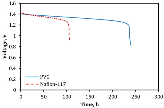 The decay rate of discharge capacity for the VPG-VRFB, as shown in Figure 14b, was also notably slower than for the Nafion-VRFB, especially during the first 15 cycles, which is consistent with the previous observation of slower self-discharge rate for the VPG-VRFB. The VPG-VRFB exhibited a linear decrease of discharge capacity with cycle number while the discharge capacity decay rate for the Nafion-VRFB was much faster in the beginning (first 15 cycles) and then tended to stabilize. This difference of the capacity decay rate for the Nafion-VRFB between the initial and late periods of operation may be a result of reduced vanadium ion crossover rate by vanadium ion exchange and contamination, which saturates after a certain time. The metal ion transport rate in the nonionic VPG is not expected to change over time. However, the vanadium ion cross-mixing rate in the Nafion membrane could experience major variations before and after contamination of the water channels by the exchanged vanadium ions [13].