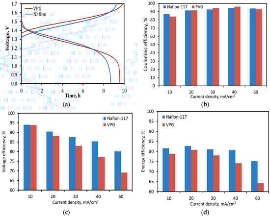 Performance of the VPG-VRFB and Nafion-VRFB in charge–discharge operations: (a) Charging and discharging curves at a current density of 30 mA/cm2, (b) CE as a function of current density, (c) VE as a function of current density, and (d) EE as a function of current density.