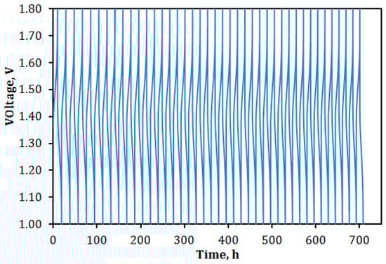 The VPG-VRFB was tested for 40 cycles of continued charge–discharge operation at a current density of 30 mA/cm2 using charging and discharging cutoff voltages of 1.8 and 0.8 V, respectively. This cyclic operation was completed over a 30-day period and the continuous charge–discharge curves are shown in Figure 13. In Figure 13, the cutoff discharging voltage is shown to be 1.0 V for better presentation because the data acquisition speed was not fast enough to record data for ≤0.8 V in some cycles before switching to charging operation.