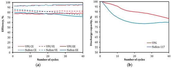 Comparisons of cyclic operation between the VPG-VRFB and Nafion-VRFB at 45 °C for a current density of 40 mA/cm2: (a) CE, VE, and EE as functions of cycle number and (b) discharge capacity as a function of cycle number.