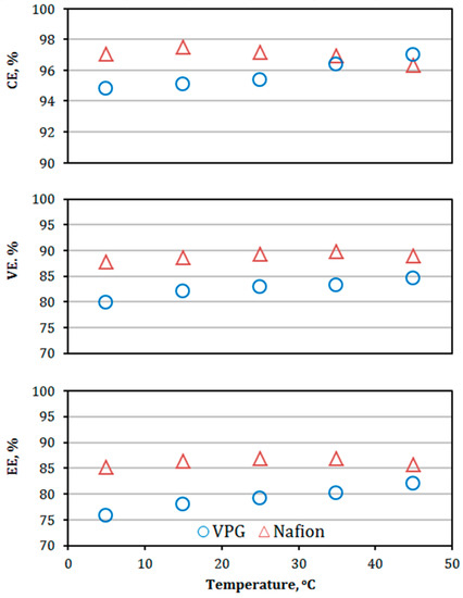 The CE, VE, and EE of the VPG-VRFB and Nafion-VRFB as functions of temperature at a charge and discharge current density of 40 mA/cm2.
