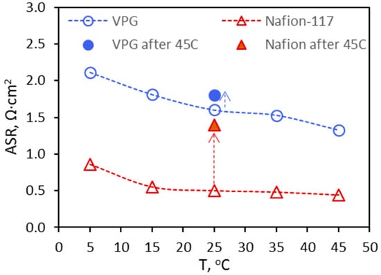 ASR of the VPG and Nafion-117 membranes measured by EIS at different temperatures under VRFB operation conditions.