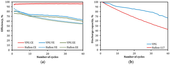 Comparison of cyclic operation between VPG-VRFB and Nafion-VRFB: (a) CE, VE, and EE and (b) discharge capacity decay.