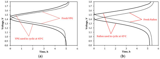 Figure 18 presents the charge–discharge curves of the VPG-VRFB and Nafion-VRFB taken at 25 °C before and after 40 cycles of operations at 45 °C. For both VPG-VRFB and Nafion-VRFB, the charge voltages became higher and the discharge voltages became lower after operating at 45 °C. This means that operating at 45 °C caused permanent losses in VE (or increase in ASR as shown in Figure 16) and consequently lowered the EE for both VRFBs. However, the permanent loss of VE and EE was much less for the VPG-VRFB than for the Nafion-VRFB. Table 3 compares the performance of the two VRFBs before and after the high temperature operations. Compared to the VRFBs with fresh membranes, the CE increased slightly by 2.8% and 1.1% for VPG-VRFB and Nafion-VRFB respectively, likely because the vanadium ions trapped in the membrane porosity at high temperature reduced the permeation of the large hydrated metal ions in later operations at 25 °C. On the other hand, the VE decreased by 4.9% for VPG-VRFB and by 10.6% for Nafion-VRFB as compared to the VRFBs with fresh membranes; and the EE (= CE × VE) was decreased by 2.3% for VPG-VRFB and 9.7% for Nafion-VRFB after high temperature operations. As a result, the VPG-VRFB exhibited an EE of 77.3%, which became more similar to that of the Nafion-VRFB (EE = 78.4%) after operating at 45 °C although the EE of the VPG-VRFB (79.1%) was significantly lower than that of the Nafion-VRFB (86.8%) before operating at high temperature. This suggests that the increased amount of vanadium ions exchanged into the Nafion membrane and the distortion of the flexible Nafion pore structure occurring at high temperature are irreversible but such adverse changes caused by high temperature operation were much smaller for the rigid and nonionic VPG membrane.