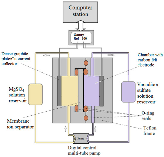 The mesoporous Vycor glass membrane and the Nafion®-117 membrane used in this study were obtained from commercial sources. The glass membrane, Vycor® porous glass (VPG) 7930, a product of Corning Inc. (Corning, NY, USA), was purchased through Advanced Glass & Ceramics (Holden, MA, USA). The VPG membrane was disc-shaped with a diameter of 2.54 cm and a thickness of 500 μm (1000-μm thick discs were also used for some material property tests). The average pore diameter (dp), porosity (ε), and specific mesopore surface area of the VPG membrane were 4 nm, 0.28, and ~250 m2/g, respectively, by manufacturer data and reports in references [24,29]. The Nafion-117 membrane, a product of DuPont, which is commonly used as a benchmark ion exchange membrane for hydrogen fuel cells and ion separators for RFBs, was obtained through Alfa Aesar (Tewksbury, MA, USA). The Nafion-117 membrane had a dry thickness of ~183 μm and exchange capacity 0.9 meq/g. The VPG and Nafion membranes were used as received without any modifications. The carbon felt used as electrodes for the VRFB was of 99.0% carbon purity and 6-mm thick without compression (Alfa Aesar, Tewksbury, MA, USA). Chemicals including vanadyl sulfate (VOSO4·4–6H2O, 99.9%), sulfuric acid (6 M H2SO4), and magnesium sulfate (MgSO4, >99.5%) were purchased from Sigma (St. Louis, Mo, USA) and used without further purification.