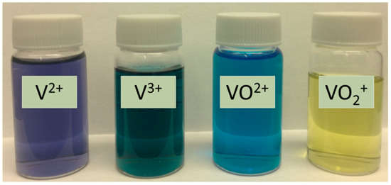 The 1 M VOSO4 (VO2+) solution was prepared directly using the purchased chemicals. The V2+, V3+, and V5+ (VO2+) sulfate solutions where obtained by electrochemical reduction and oxidation through VRFB charge–discharge operations. The RFB charge–discharge operation was performed in an apparatus depicted in Figure 19, except that the chambers on two sides of the ion separator were installed with carbon felt electrodes and a high-selectivity zeolite membrane ion separator was used for achieving ~100% state of charge (SOC) and preventing ion crossover [18,26]. The purities of the V2+, V3+, and V5+ (VO2+) were estimated to be >99% based on the SOC-dependent terminal voltages in charging and discharging processes and observation of the characteristic colors of the solutions [18,31]. The V2+ sulfate was obtained from the cathodic side of charging when the voltage reached 1.75 V and the solution color turned into the characteristic color of purple; meanwhile, the solution at the anodic side was taken for V5+ (VO2+) which appeared with the characteristic yellow color. The solution of V3+ was obtained after the discharge voltage dropped to zero and the solution turned into the characteristic color of green. The photographs of the different vanadium ion solutions obtained in this work by the charging and discharging processes are shown in Figure 20.