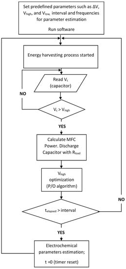 Throughout all tests, energy harvesting was optimized with the Perturbation and Observation (P/O) algorithm described below. Biobattery (MFC) internal parameters were monitored in real-time using a non-disruptive equivalent electrical circuit (EEC) model parameter estimation procedure []. The software for implementing these procedures was written in MATLAB 2017a (Mathworks, Natick, MA, USA). This software was capable of real-time data acquisition and controlling relays for connecting and disconnecting external resistance using a Labjack U3-LV data acquisition board (LabJack Corp., Lakewood, CO, USA). Figure 2 explains the power management algorithm of the biobattery.