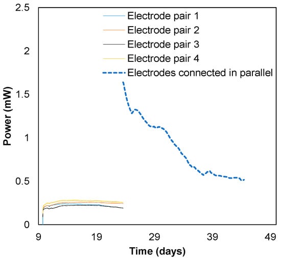 The biobattery operation was initiated in open circuit mode. The open circuit voltage (OCV) of each electrode pair was observed to rapidly increase reaching 450–520 mV after first 9 days of biobattery operation. The mixed microbial community of the solid anolyte composed of humus and saw dust contained a sufficient quantity of anodophilic microorganisms, which colonized the carbon felt electrodes forming an anodophilic biofilm []. Biofilm formation at the anode of a microbial fuel cell has been extensively studied [,,] showing progressive development of the anodophilic biofilm. Upon connecting 1000 Ohm resistors to each electrode pair on day 9, an average power output of 0.25 mW was obtained almost instantly (Figure 3). The short startup time can be attributed to a rapid development of the anodophilic biofilm and the associated increase of internal capacitance [].