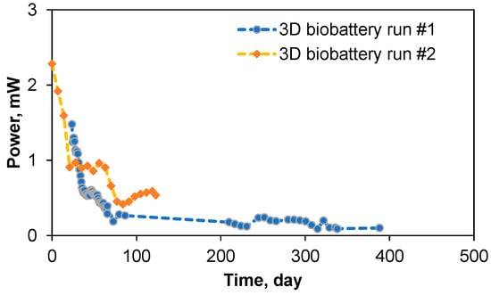 After the completion of experiments aimed at studying the 3D biobattery response to various external perturbations, the biobattery operation was continued for a total of 388 days (run 1) as shown in Figure 6. Data points corresponding to biobattery operation at different temperatures, NaCl concentration, and carbon source addition were excluded in this graph. As can be seen from this plot, the power output decreased with time, and was around 0.1 mW after 388 days of operation. Thereafter, the solid anolyte was replaced and the biobattery was operated for another 123 days (run 2). The power output profiles in both runs were similar, reflecting progressive depletion of the solid carbon source (fuel) in the biobattery.