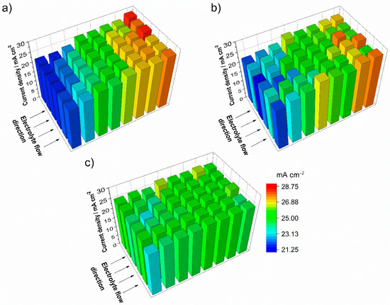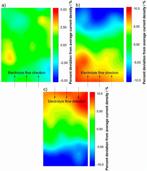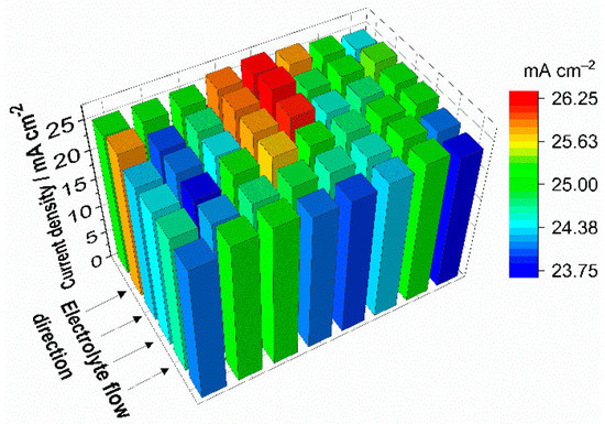 The machine-made printed circuit board electrode offers a higher accuracy (around ±2% of the measurement setup) than hand-built hard-wired segmented electrodes. Small deviations in the current density distribution in the accuracy range of the printed circuit board can be measured in the test cell. The sensitivity of the measurement setup is tested by investigations of the test cell at operating conditions where only a very small inhomogeneity of the current density distribution occurs. While charging the test cell with 25 mA cm−2 at an electrolyte flow rate of 2.5 mL min−1 cm−2 there is only a small change in the electrolyte concentration gradient, and the current density distribution is a result of different effects. Due to the high λ > 100 at this operation point there is no mass transport limitation, and the current density distribution is mainly dominated by ohmic resistances and activation losses. For two experiments at the same flow rate and the same charging current, the electrolyte flow structure in the test cell is varied. By comparing the resulting current density distribution, the accuracy of the measurement setup is demonstrated. The mapping presented in Figure 6 shows the differences in the current density distributions of the test cell at a modified electrolyte inlet.