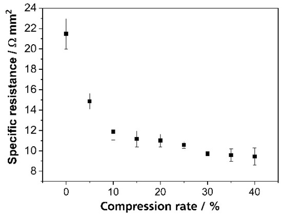 The electrical resistance of the GFA5 graphite felt is a function of its compression. In addition, a higher compression leads to smaller contact resistances between the porous electrode and the bipolar plate. Non-uniform compression of the graphite felt in the redox flow battery results in non-uniform contact resistances along the electrode surface. Figure 2 shows the specific electric resistance of the GFA5 graphite felt at different compression rates.