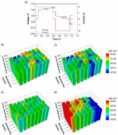 Current and voltage of the test cell during galvanostatic cycling (a) and current density distribution at different operating points at a current of 50 mA cm−2 and an electrolyte flow rate of 2.5 mL min−1 cm−2 (λ ≈ 60 at start): Charging around SOC 50% (b), close to the end of the charging process (c), discharge around SOC 50% (d) and close to end of the discharging process (e). The printed circuit board was installed at the cathode of the test cell.