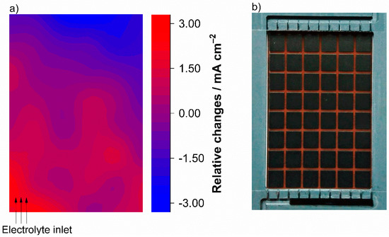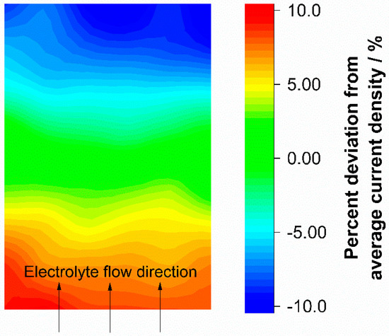 Current density distribution during discharge with 100 mA cm−2 and an electrolyte flow rate of 0.5 mL min−1 cm−2 (λ ≈ 6.5). Electrolyte flow was from the bottom to the top and the ohmic resistance induced current density distribution from Figure 4a was subtracted as an offset.