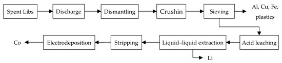 In more than half of these batteries, the cathode contains any of the following compounds: LiCoO2 and LiNi0.33Co0.33Mn0.33O2 [6]. As previously mentioned, cobalt accounts for around 20 wt% of spent LiBs. These residues also contain lithium, nickel, copper, and aluminum; however, there is a higher composition of cobalt than the other metals, which is why it is important to recover [5,7]. Due to the complicated assembly of the batteries and the composition of the electrodes, recycling LiBs requires physical and chemical processes. Physical processes include pretreatments, such as dismantling, crushing, screening, magnetic separation, washing, and thermal pretreatment. Chemical processes include acid leaching, bioleaching, ultrasonic-assisted separation, solvent extraction, chemical precipitation, and electrochemical processes [6,8,9].