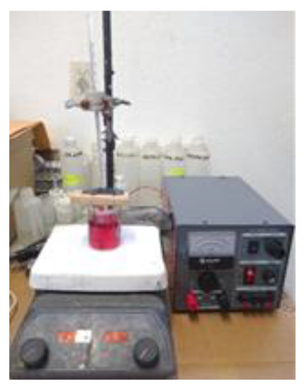 Electrodeposition. The stripping solution of cobalt was treated in a system with a lead anode and a stainless-steel cathode, both with an area of 0.00499 m2. The electrodes were cleaned and polished and the temperature was controlled. The system for electrodeposition is shown in the Figure 3 with a regulated DC power supply. The effect of the current over the cobalt deposition was studied by testing five values for current (0.25 A, 0.5 A, 0.75 A, 1 A, and 1.5 A). The current efficiency was computed as: