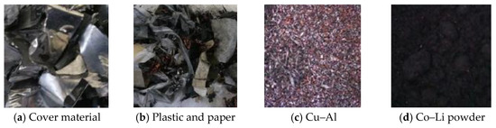 Figure 4 shows the fractions obtained in this study. Figure 4c shows the copper and aluminum fractions with a particle size greater than 0.25 mm, while Figure 4d presents the cobalt–lithium powder with a particle size smaller than 0.105 mm.