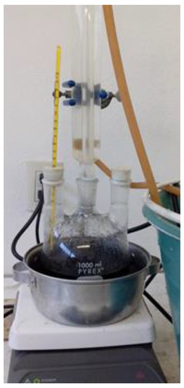 Leaching was performed in sulfuric acid (2 mol/L) and hydrogen peroxide (6 vol%) at a solid-to-liquid ratio of 1/10 and a temperature of 75 °C for 90 min; the system is shown in Figure 5. Operating conditions were taken from a preliminary work, which reported that such leaching conditions allow for obtaining the highest efficiency [30].