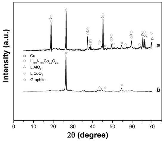 Spectra of X-ray diffraction analysis before (a) and after (b) leaching. Al2O3 PDF Card #00-010-0173, Cu PDF Card #00-004-0836, C (graphite) PDF Card #00-026-1079, Li0.9Ni0.5Co0.5O2−x PDF Card #00-050-0509, LiAlO2 PDF Card #00-044-0224, and LiCoO2 PDF Card #00-050-0653. PDF = Powder Diffraction File.