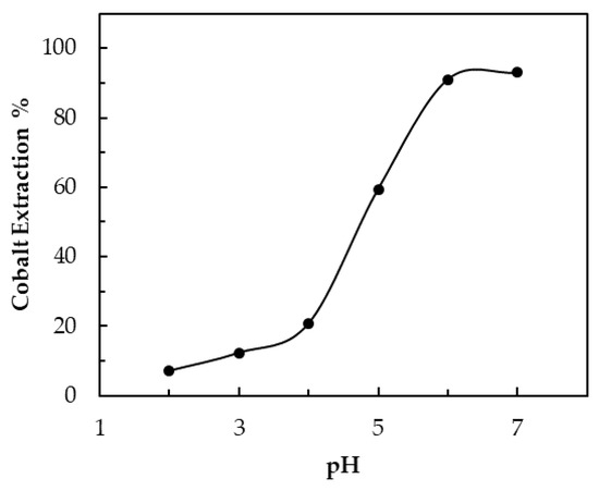 Based on preliminary tests, an evaluation pH range between 2 and 7 was used, with steps of 1 unit. After sulfur acid leaching, the aqueous phase obtained a pH near 0. Then, in order to control pH, a sodium hydroxide concentrated solution was added. Figure 7 shows that the extraction percentage increased as pH increased. For cobalt extraction, pH was a key factor. Within the evaluation range for pH values, there were low extraction percentages, starting from 7% to 12% for a pH range from 2 to 3, up to yield values as high as 92% or 93% with pH values of 6 and 7.