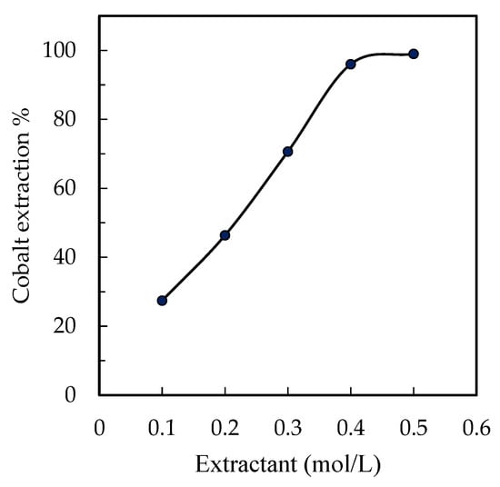 Cobalt was extracted using the extractant Cyanex 272 diluted in kerosene. The extractant concentration was evaluated in the range between 0.1 mol/L and 0.5 mol/L, with 0.1-mol/L steps. Figure 8 shows that the extraction yield increased as the extractant concentration increased. Within the evaluation range for concentration values, slightly low values around 27% were observed for a 0.1-mol/L extractant concentration; on the other hand, values as high as 97% or 99% were obtained for concentration values between 0.4 mol/L and 0.5 mol/L.