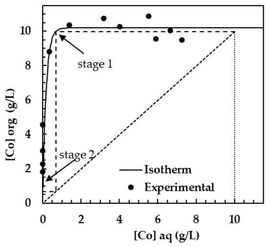 In order to regenerate the extractant and obtain a cobalt electrolyte solution for subsequent electrodeposition, the correlation between the concentration of cobalt in the aqueous phase ([Co]aq) and the organic phase ([Co]org) was defined by Equation (6):