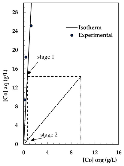 For an initial concentration of 9.630 g/L of cobalt in the organic phase, two theoretical extraction stages were obtained, with a rate of O/A = 1.5 and a final concentration of cobalt of 37.87 mg/L. The calculation of these steps is shown in Figure 12.