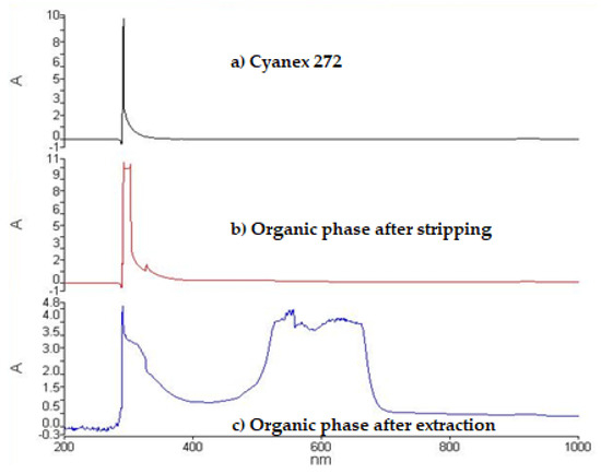 UV-VIS spectra: (a) Cyanex 272 in kerosene, (b) organic phase after stripping, and (c) organic phase complex cobalt–Cyanex 272 after extraction.