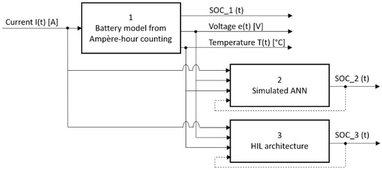 Typically, the design of ANNs consists of three phases: training, test and validation. The training phase is conducted exploiting datasets reproducing the widest possible range of the system dynamics to allow an accurate learning. In this study, the training datasets include the current, voltage and temperature measurements as network inputs and the SOC as the output target. Since the SOC is a non-measurable quantity, its value is obtained from a look-up table battery model tuned by means of the Ampère-hour counting method performed in a laboratory environment. This model (block 1 in Figure 1) is then used as an emulator of the real battery to generate the expected SOC reference. The proposed ANNs architectures (block 2) are designed and simulated in the Matlab/Simulink environment and then deployed on a real electronic control unit with a Hardware in the Loop (HIL) configuration (block 3) based on an Atmel AVR 8-bit processor in serial communication with a computer. The calculation performance of this processor is comparable to that of common BMSs.