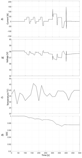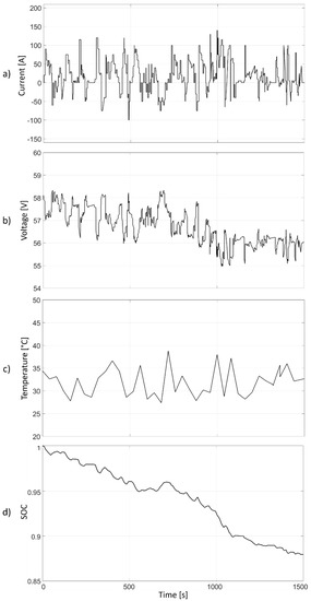 The adopted training dataset is obtained from a current charge/discharge profile of a real EV that is reported in [34]. The dataset is shown in Figure 4, where the values of the voltage (Figure 4b), temperature (Figure 4c) and SOC (Figure 4d) are obtained from the reference model (the block 1 in Figure 1) when the input of the model is the current (Figure 4a). The data are sampled with a frequency of 10 Hz. Since this profile produces a reduction of SOC equal to 12.5%, it is replicated eight times in the training dataset to obtain a full discharge of the battery.